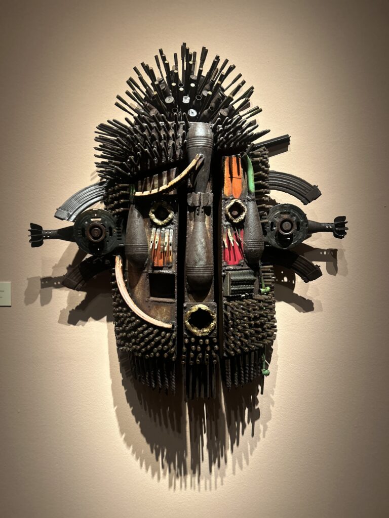 The exhibition’s next movement explores the sacred and the ancestral. Seyni Awa Camara’s terracotta figures—maternal, mythic, and fertile—embody a cosmology where human, animal, and divine coexist. Mozambican artist Gonçalo Mabunda transforms decommissioned weapons into haunting totems, reclaiming objects of violence as symbols of resilience. Meanwhile, Congolese artist Géraldine Tobe paints with soot rather than pigment, conjuring ethereal figures shrouded in smoke and memory. Her work, Vanité de Vanité, becomes a meditation on spirit and self in postcolonial Africa.