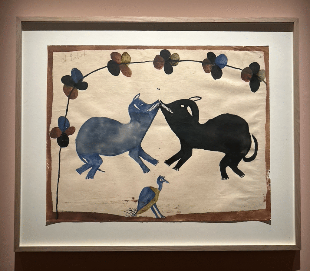 The opening gallery, Emergence, traces the dawn of African modernism through early Congolese painters Albert and Antoinette Lubaki and Djilatendo. Their delicate watercolours—depicting elephants, village scenes, and abstracted birds—mark some of the first known modern paintings from sub-Saharan Africa. These works, at once naïve and visionary, reveal how African artists transformed local traditions into new pictorial languages without imitating European models.