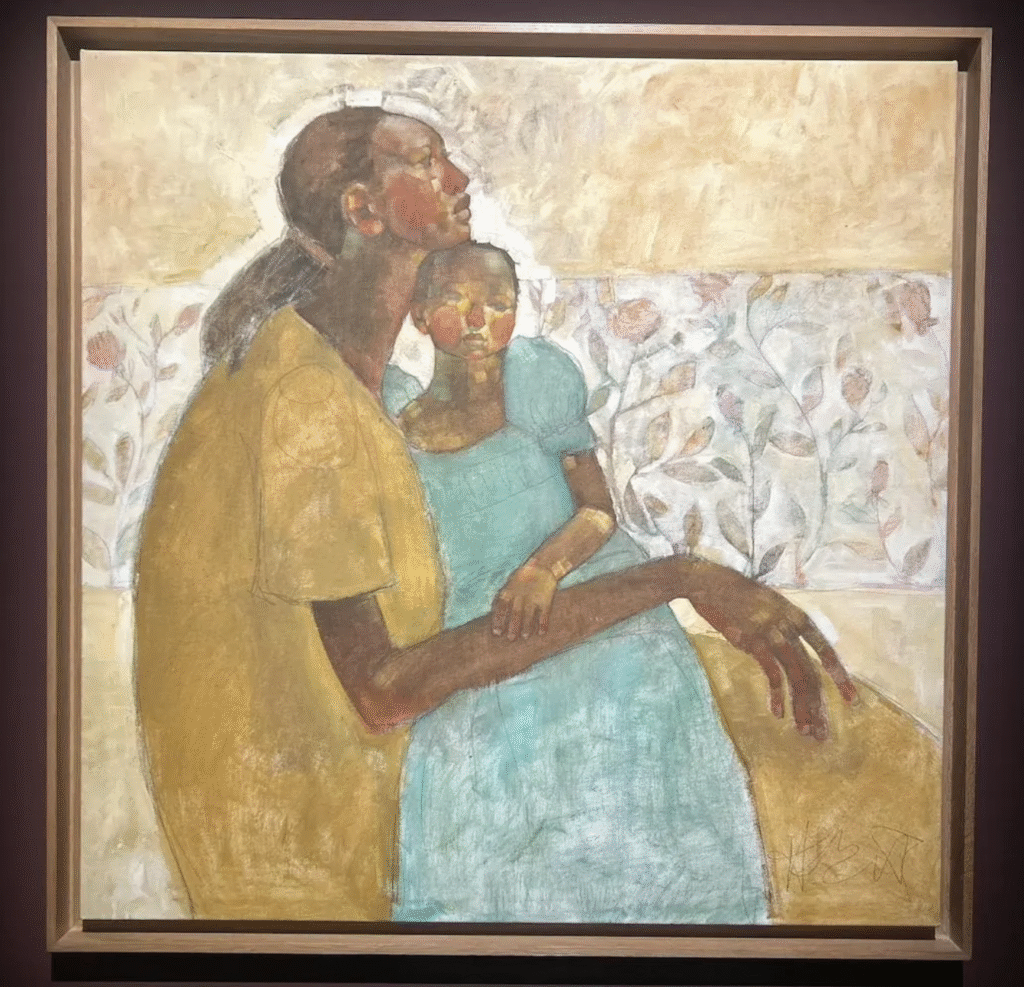 Yet moments of calm emerge. Congolese master Moke paints couples sharing meals, laughter, and intimacy—snapshots of joy amid the turbulence of postcolonial urban life. Tender portraits by Abe Odedina, Cassi Namoda, Kaloki Nyamai, and Victor Olaoye reveal a contemporary African portraiture grounded in empathy and everyday grace. A luminous highlight is Olivia Mae Pendergast’s mother-and-child painting, whose dappled light evokes Impressionism filtered through African warmth—a vision of continuity and peace.