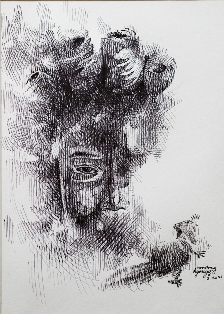 Agoyero is a magician with a pencil, using drawing and collaged paper to create captivating images with intriguing titles such as Ambivalence of a Trickster, which depicts a majestic looking tortoise held aloft by person with their tattoo-covered back towards the viewer. With the drawing Before the Dawn, Agoyero creates an optical illusion where a figure emerges from an intricate tree-like structure, and a spherical shape – which could be a globe or a pregnant belly –  becomes the focal point of the image.  A cat’s face stares out of the image and a pair of chickens are perched on top of the tree’s branches. Echoes of the Wild is a ghostly, half-formed portrait with one eye looking pensively at the viewer, created using cross-hatching strokes and bold pencil marks.