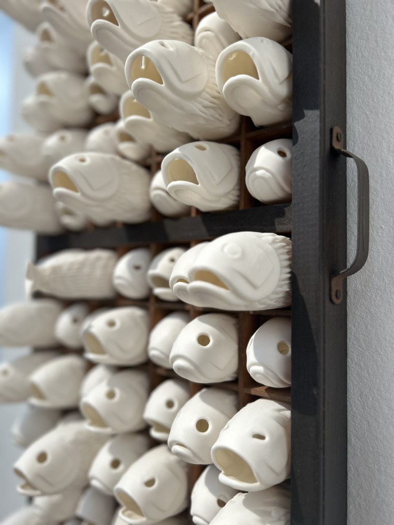 Her sculptures combine spiky porcelain fish forms with antique Japanese wooden objects such as print drawers, dough trays, stools, ladders, and chopping boards, creating a quiet tension between fragility and endurance, past and future. In Japanese culture, particularly within Ainu traditions, salmon symbolises sustenance, perseverance, and spiritual connection. Here, the fish appear as spectral presences.