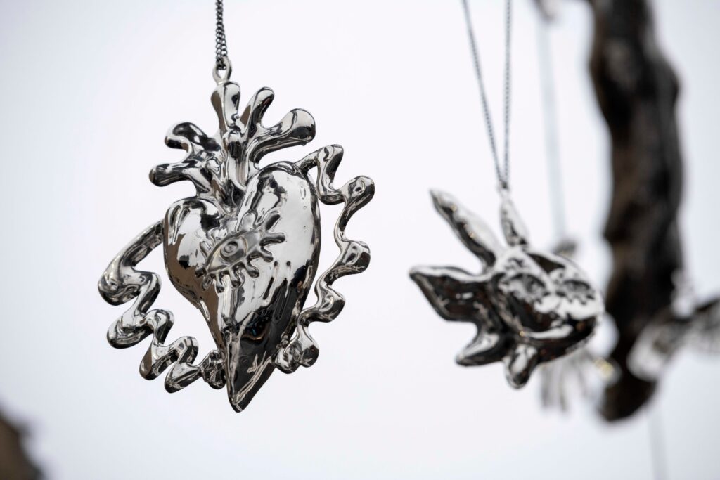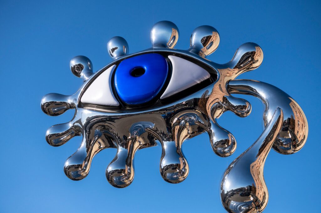 On view from 10th March 2026, Colbert’s reflective steel sculptures stand 30 feet high, marking the artist’s most ambitious public installation so far. The works draw on her distinctive vocabulary of symbols, dreams and surrealist-inspired imagery.
