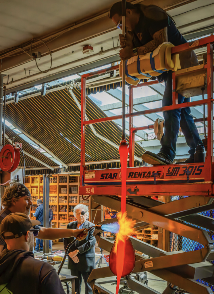 (L-R): Jason Christian, James Mongrain,Chihuly, and Emmanuel Aguilera-SantosThe Hotshop, The Boathouse, Seattle, 2024© 2024 Chihuly Studio. All rights reserved.Photo by Nathaniel Willson