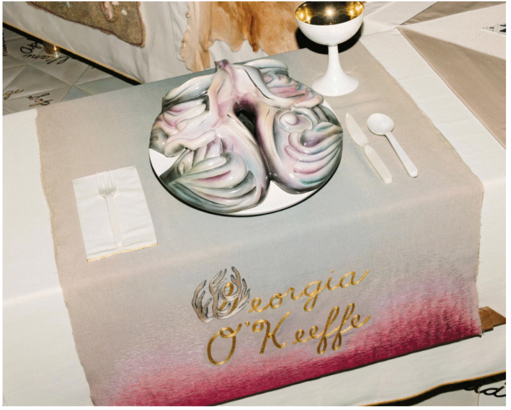 Judy Chicago’s “The Dinner Party” at the Brooklyn Museum is an iconic piece of feminist art from the late 1970s. The huge installation took a team of over 400 volunteers (including ceramicists, needleworkers, historians and students) five years to create, between 1974-79. The Dinner Party format is a triangular dinner table set with placements for 39 historical women. Conceptually, you couldn’t find an artwork that so clearly represents the feminist movement of that era, giving women who are not represented in history a symbolic seat at the table (with another 999 names inscribed in the Heritage Floor on which the table rests).