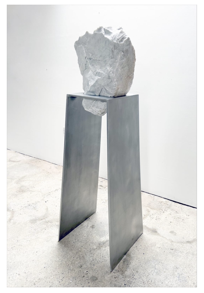For me, the theme generated images of geology, new forms and playfulness. Recent works draw on the poetic potential of re-siting geological artefacts into new contexts. Therefore, I first responded with the sculpture Bianco Matter. The artwork is made from a piece of white marble presented to the viewer as an object of stability. There is a performative element with the rock being collected from a quarry in Italy as it was originally being discarded as surplus. Set upon a modern stainless-steel pedestal, there a bond between the natural and the constructed. There is also an act of grounding and reconnecting with the earth offering a subtle immersion in motion, transformation and balance.