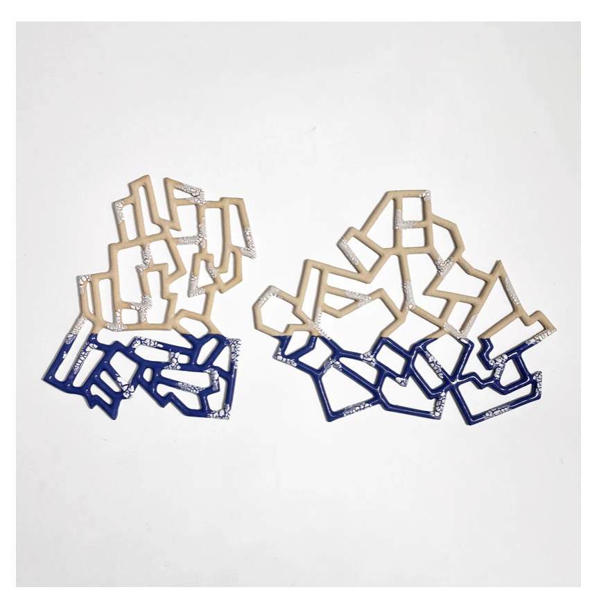 My practice is rooted in ceramics, and because clay is made by the weathering and erosion of rock, it connects naturally to the exhibition’s title. For this show, I created a wall-hanging diptych titled Mineral Traces. Each piece is essentially a drawing: I extrude clay coils, cut them, and reassemble them into linear compositions based on the crystal structures found in mineral specimens — a way of translating a three-dimensional form into a two-dimensional image. The surface is finished with a crawling glaze that fractures during firing. I think of the work as a collaboration between material, alchemy, and myself.