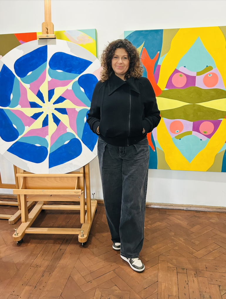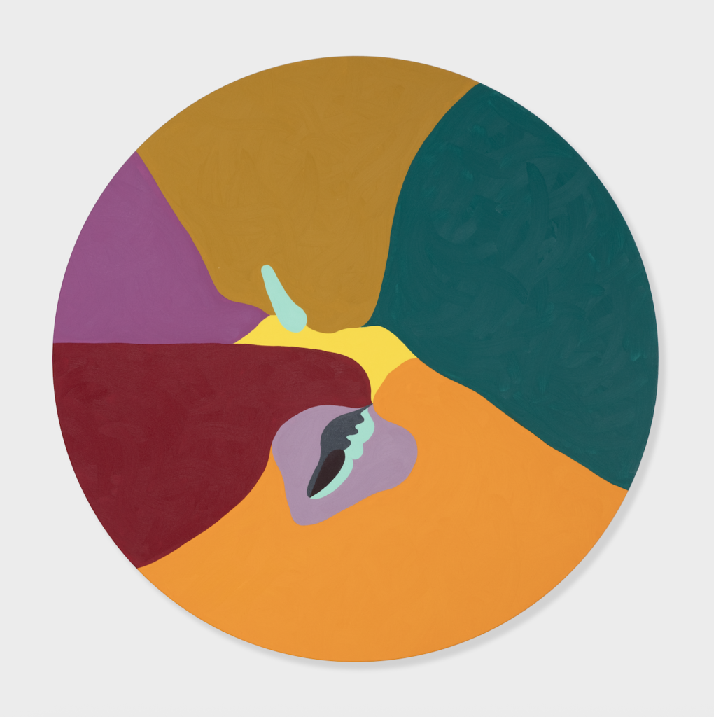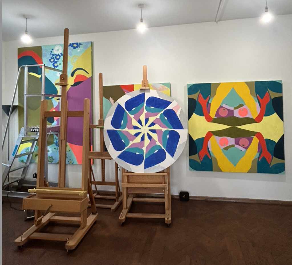My work has always been informed by my beginnings in the film industry, and studying graphics at Bournemouth. Framing is an important part of my practice, and I continue to play with cropping and editing found images to come up with the most dynamic form for each new painting. As an artist, you always draw on experience. My new works in the studio are inspired by the chaos of my life recently, and they are kinetic and kaleidoscopic to reflect this. Playing with these reoccurring shapes and cycles to create patterns and order, is my way of navigating this period of uncertainty in my life.