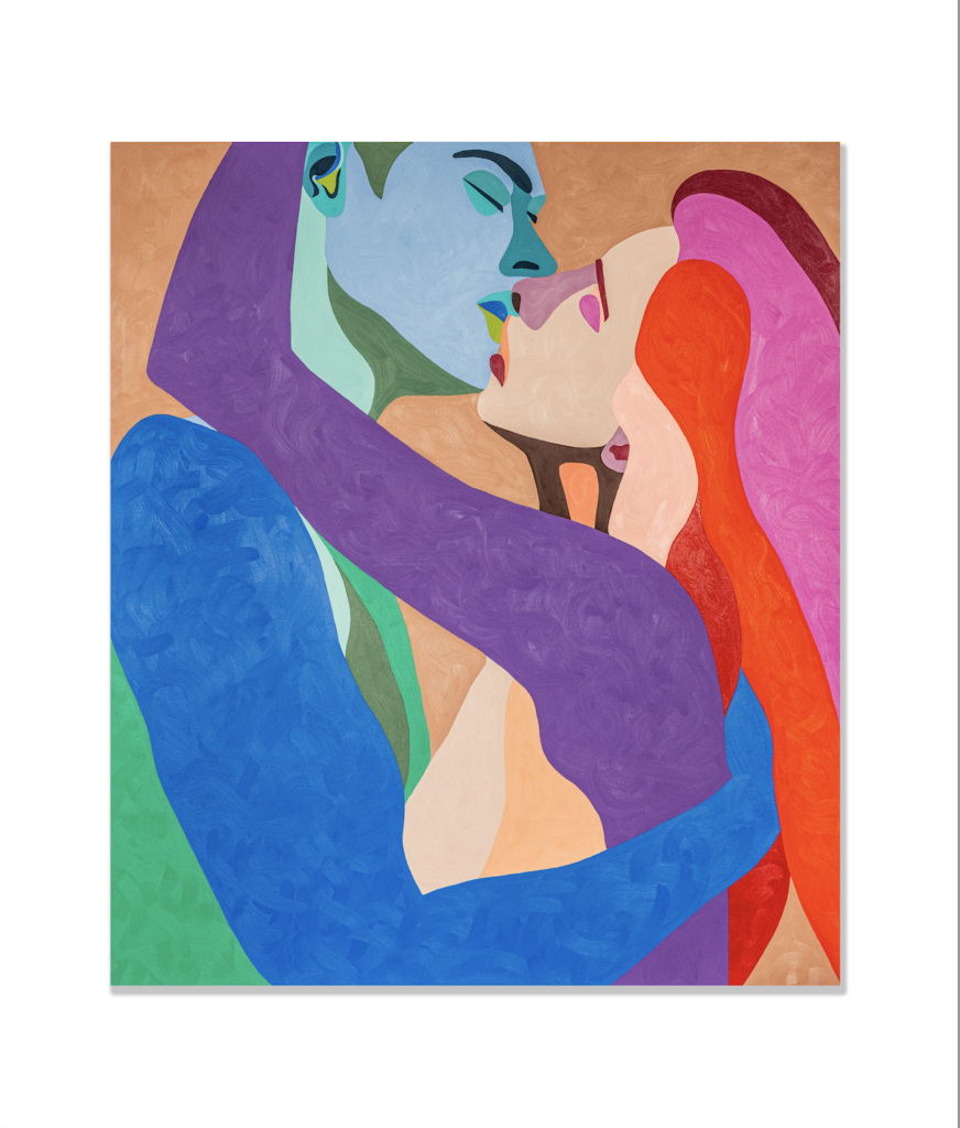 Your work is celebrated for its fearless exploration of intimacy and the erotic, rendered through a distinctly vibrant and tactile visual language. During our visit to your Brighton studio, colour and movement felt almost kinetic. How do you think your background in film and art direction continues to inform the way you frame, crop and choreograph bodies on the canvas?