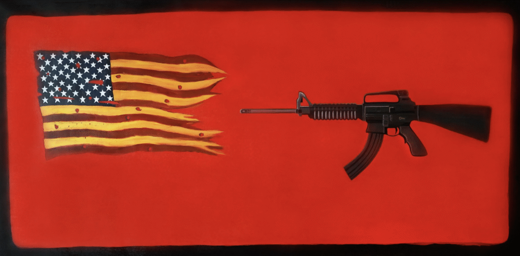 The Anxiety Series oil paintings began when the Covid pandemic forced most of us to shelter in place for long periods of time. My father Matthew Mack, a wonderful plein air painter, had passed away and left me all of his art supplies, so it felt right for me to begin to paint. The resulting floating head paintings hovering over solid endless backgrounds only confirmed the anxiety we all were feeling. As I continued painting, monstrous creatures began to appear. Then the canvases got larger and larger, up to 4 by 8 feet and some even became political. Such as an AR-15 assault rifle shooting holes through the American flag and three beautiful glaciers that are on fire.