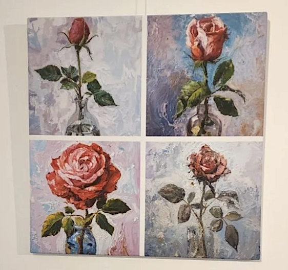 At the AMOVE Gallery exhibition, I presented works about transformation, fragility, and the cycles of life in nature. Some of the works featured flowers, especially roses, which for me became symbols of beauty, time, and vulnerability. I’m very interested in observing how nature is constantly changing, and I see that as a reflection of human life as well. Even when there is no visible human figure in my work, human presence is often still felt.