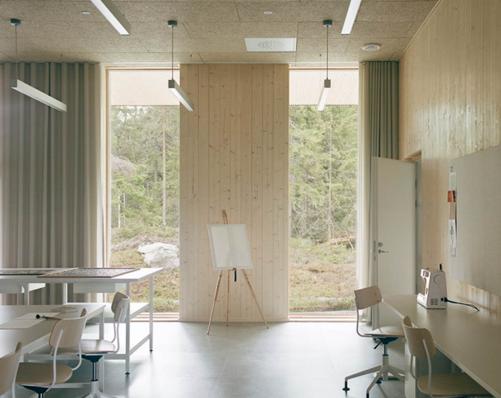 Designed by award winning Anttinen Oiva Architects, the Lagmansgården seamlessly integrates residential, educational, and therapeutic spaces into a unified, nature-oriented setting. The complex comprises school and residential buildings featuring 20 accommodation rooms across four units, alongside classrooms, recreational areas, administrative spaces, and a communal kitchen with a dining hall. Designed around a central courtyard opening toward the lakeside, the layout respects the site’s century-old pine forest and fosters outdoor activity and social connection.