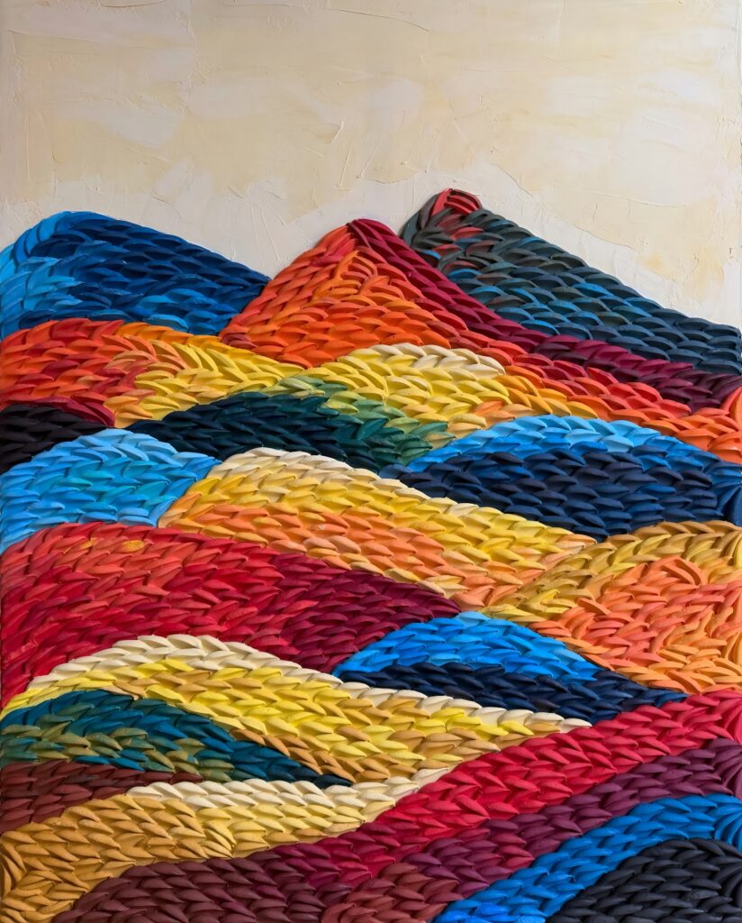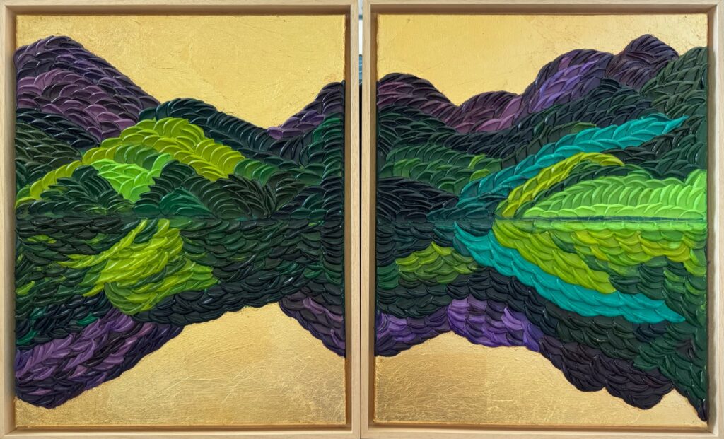 Painting becomes a form of soliloquy, a private dialogue between the conscious and the intuitive. The terrains that emerge are internal – resilience, longing, expansion, surrender. Mountains become thresholds. Rivers become transitions. Light becomes insight.