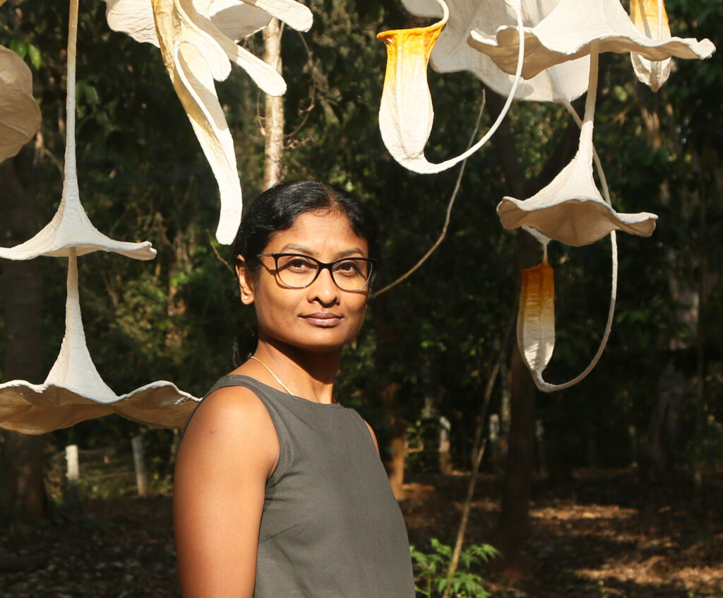 appear to defy gravity. Working in Karnataka, she translates natural materials into