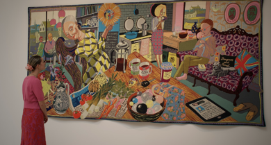 The Turner-Prize-winning artist’s tapestries are on display in the light-filled galleries adjacent to Sir John Soane’s former country residence, where original Hogarth engravings of A Rake’s Progress depicting 18th working class escapades are displayed.