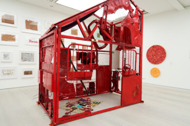 In Reframed, artists were invited to create works reflecting their own or others’ experiences of homelessness. Highlights of the exhibition ‘Home 2013’, a sculpture by Award-winning social justice artist David Tovey made from scraps of metal and panels from a Peugeot 206, the type of car which was the artist’s home for six months. The shed-shaped sculpture is painted burgundy red colour, similar to a paratrooper’s beret, reflecting Tovey’s military background. Tovey once used the services of homelessness charity ‘The Passage’, and now hosts art classes at one of its residential projects.