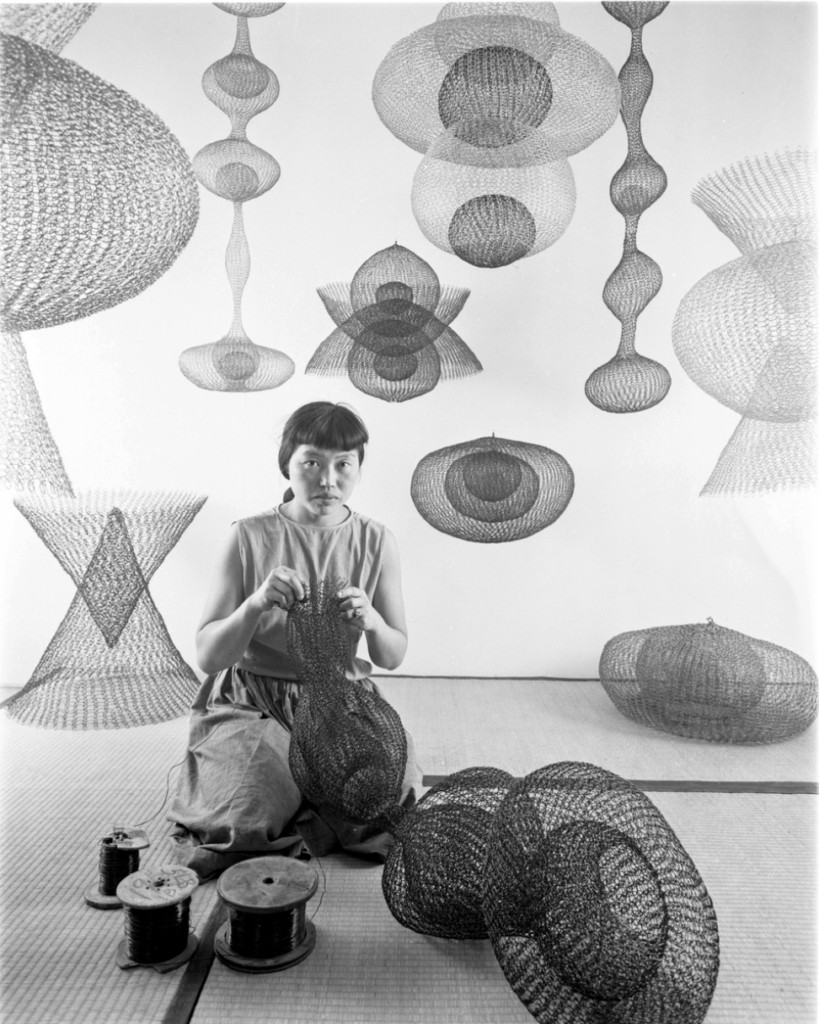 Asawa’s commercial designs from the early 1950s are exhibited in the retrospective, including plastic panels based on her paperfolds and wallpaper and textile patterns incorporating logarithmic spiral forms. Other important works featured include; The Tamarind Prints of 1965; Nature, Tied Wire and Later Sculpture of the 1960s-1990s; and large-scale works including her Origami Fountains of 1975–76.