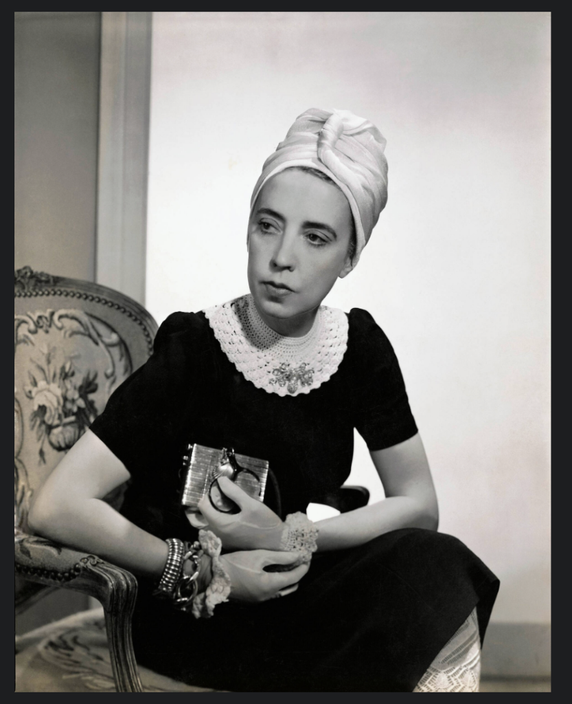 Designer Elsa Schiaparelli wearing black silk dress with crocheted collar of her own design and a turban, photograph by Fredrich Baker, Vogue, 1940