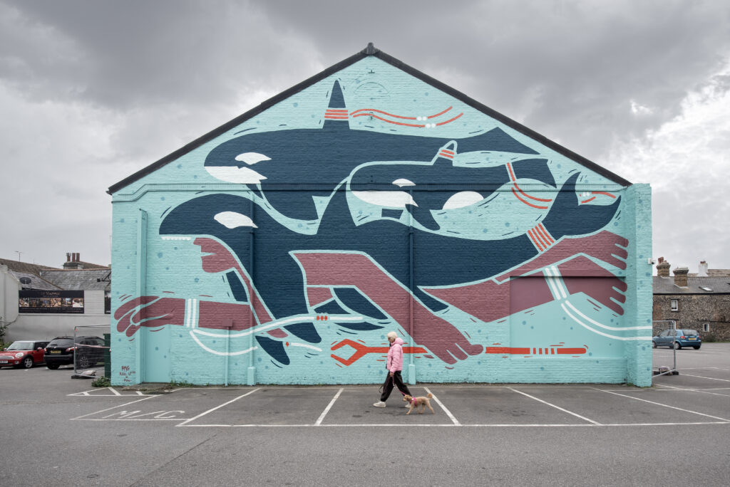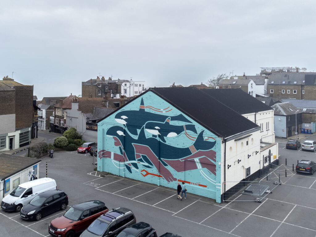 I began by thinking about areas of ocean conservation that were already present within my mind. Having an existing interest in the protection of orcas and sharks within our UK waters this was an easy starting point of inspiration for me. I was aware of the fact that orcas are matriarchal species and that female sharks are often viewed as dominant, especially when pregnant. I thought this was a a beautiful way to symbolise the importance of the power of women and link it to species that are under threat due to pollution, fishing and bycatch. Orcas and Tope Sharks, although hard to spot by those not looking, have also been recorded along the coast near where the murals were painted. Connecting the subjects of the murals to the location and opening up a conversation for those who are unaware of what species actually live alongside them and the importance of awareness in order to help protect them.