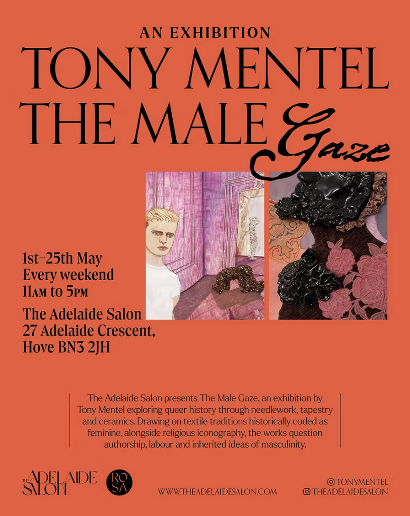 Opening this May in Hove, The Male Gaze by Tony Mentel, presented by The Adelaide Salon as part of the Brighton Festival Open Houses, is a compelling solo exhibition that explores queer identity, memory, and coded histories through intricate craft-based works.