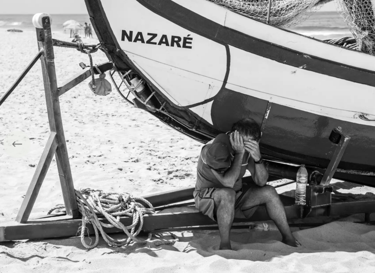 At the heart of Cunha de Sá’s documentary practice lies an acute awareness of disappearing traditions. His photographs of fishermen along the Portuguese coast are neither nostalgic Romanticisms nor overt political polemics. Instead, they function as testimonies. Portugal’s national identity is historically bound to the sea, celebrated in its anthem and mythology, yet Cunha de Sá’s images expose the fragility beneath this heroic narrative. The fishermen he photographs inhabit a precarious present shaped by industrial trawling, environmental degradation, and economic marginalisation. Rendered in black and white, their faces and gestures are stripped of distraction, foregrounding labour-worn bodies and a quiet dignity forged through endurance. The choice of monochrome is not merely aesthetic; it situates the images within a continuum of social documentary photography, aligning Cunha de Sá with figures such as Sebastião Salgado and Eve Arnold, while heightening emotional gravity and temporal ambiguity. These photographs feel both contemporary and archival, providing visual records of a way of life on the brink of erasure.